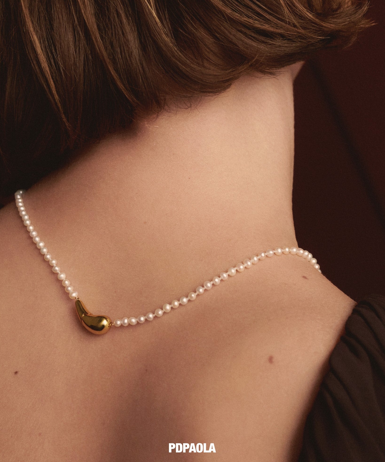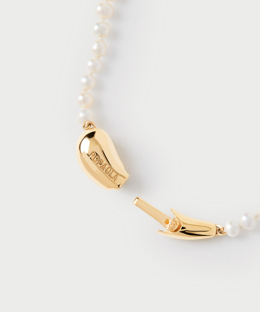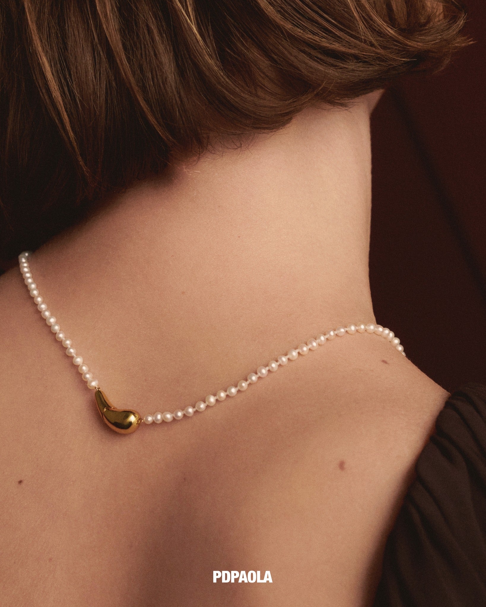 Realizzata in argento 925 placcato oro 18 carati, è composta da una fila di eleganti perle coltivate di acqua dolce che culminano in un ciondolo dorato dal design organico e scultoreo, inciso con il logo del brand.