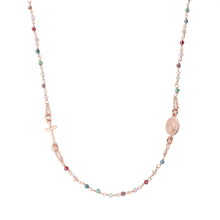 Rosario girocollo in argento 925 rosé con grani da 2,5 mm di cristalli sfaccettati multicolor in toni rosa, rosso e verde pastello, croce e medaglietta rappresentante la Madonna Miracolosa.