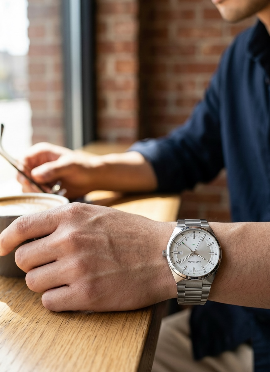 Orologio in acciaio con meccanismo al quarzo con funzione GMT. Quadrante con indici a bastoni e datatorio a ore 3. Bracciale di color argento integrato con la cassa. L'orologio presenta, inoltre, una resistenza all'acqua pari a 3 ATM.