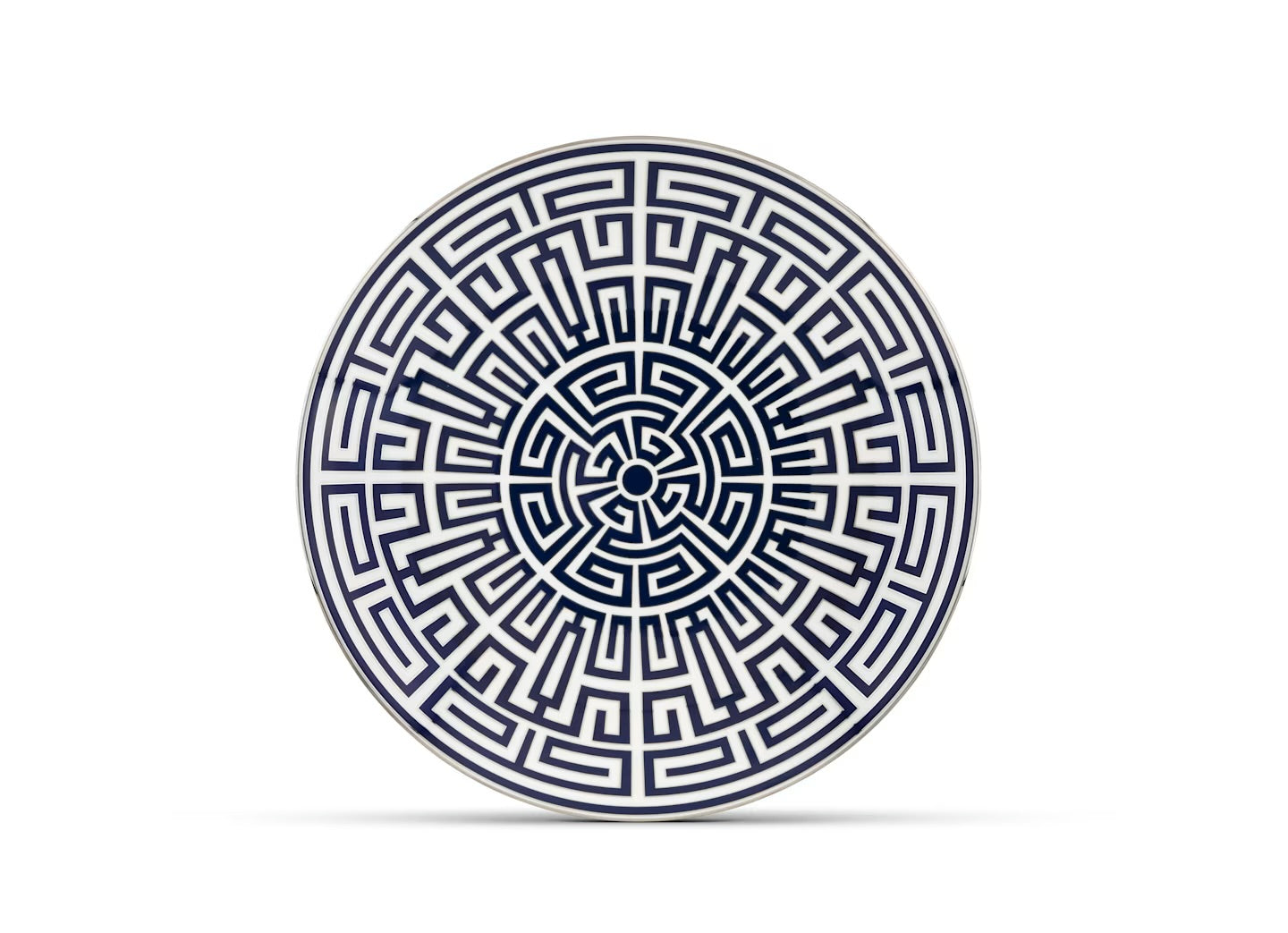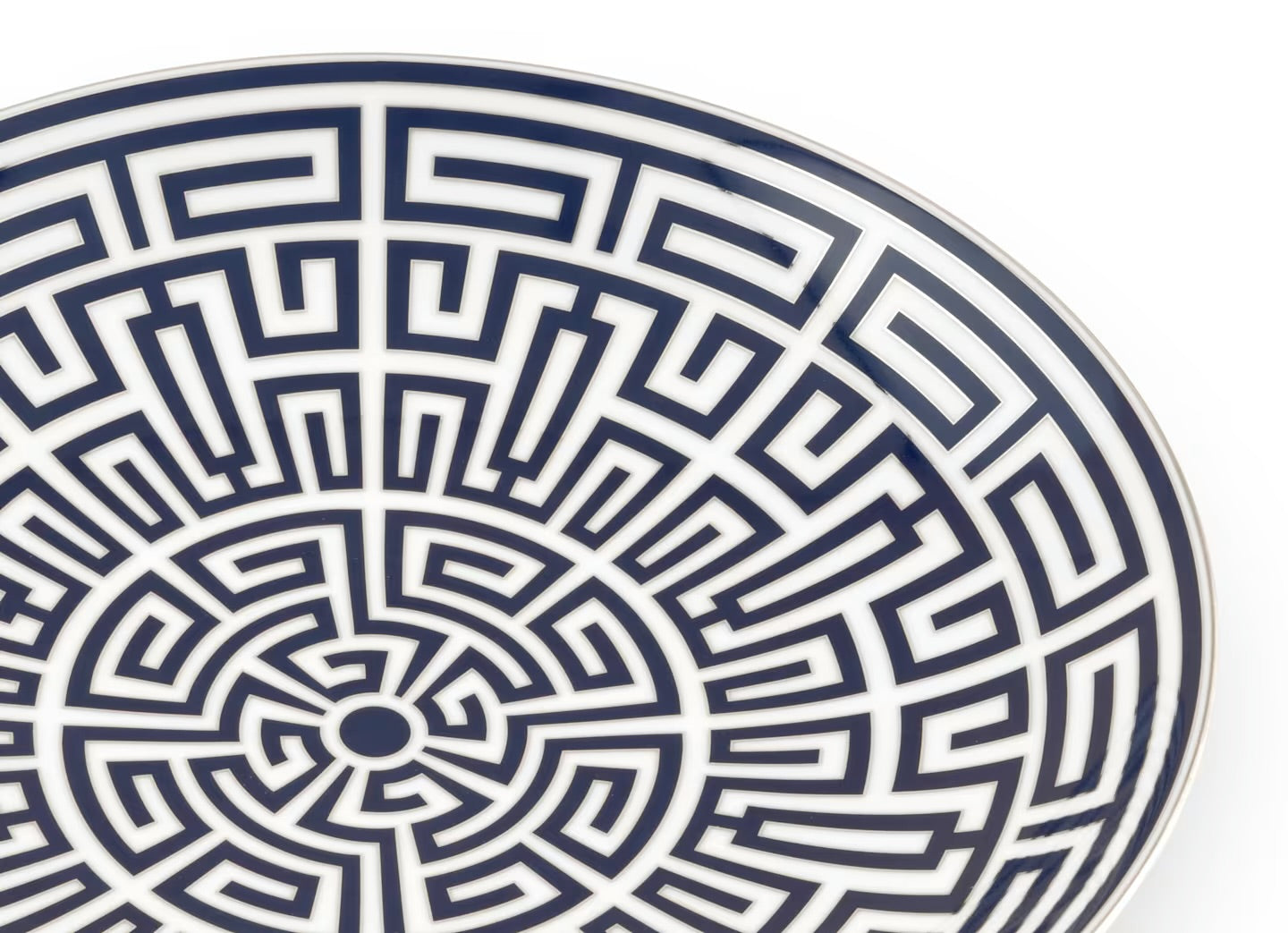 Piatto centrotavola in porcellana con decoro blu e platino. Collezione Labirintodi Gio Ponti.