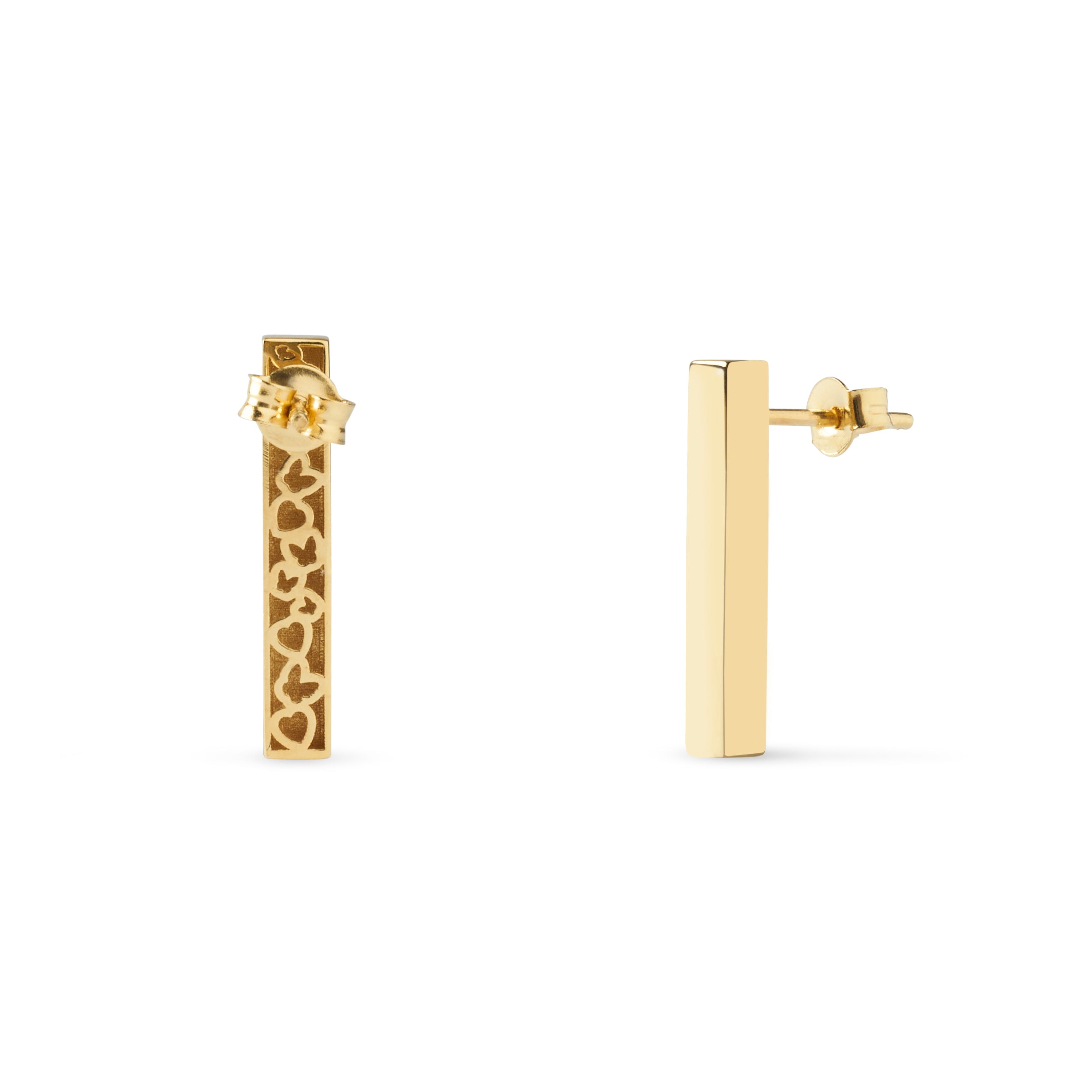 Gli orecchini Barretta di Giulia It’s Me sono realizzati in oro 9kt e si distinguono per il loro design moderno ed essenziale, che cela un dettaglio sorprendente: un raffinato motivo traforato di cuori e farfalle sul retro, simbolo di leggerezza e amore.