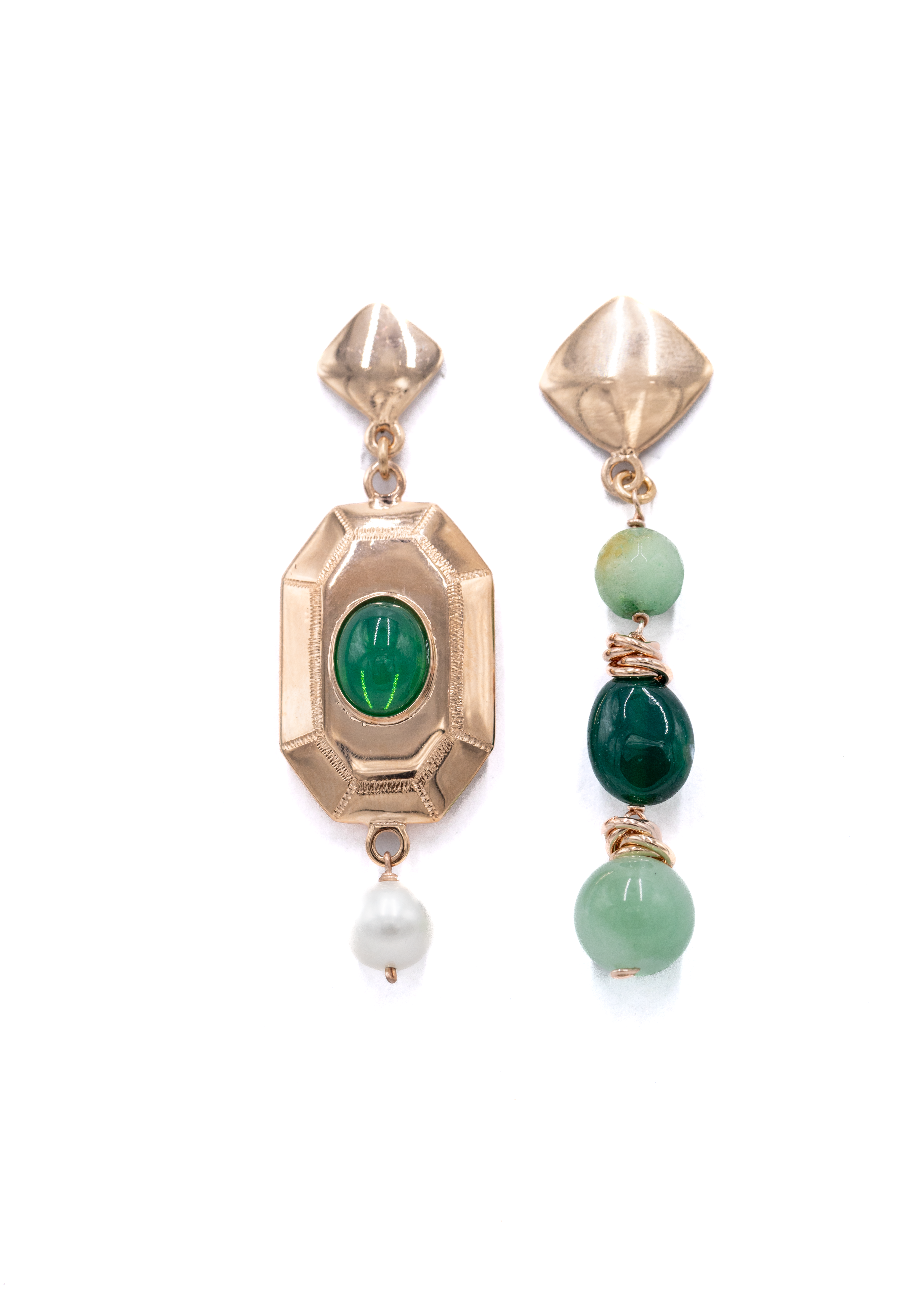 Un lato presenta un’imponente pietra centrale incastonata in una struttura geometrica, impreziosita da una perla naturale pendente, mentre l’altro gioca con tre sfere in pietra naturale dai toni verdi avvolte da delicati fili metallici.