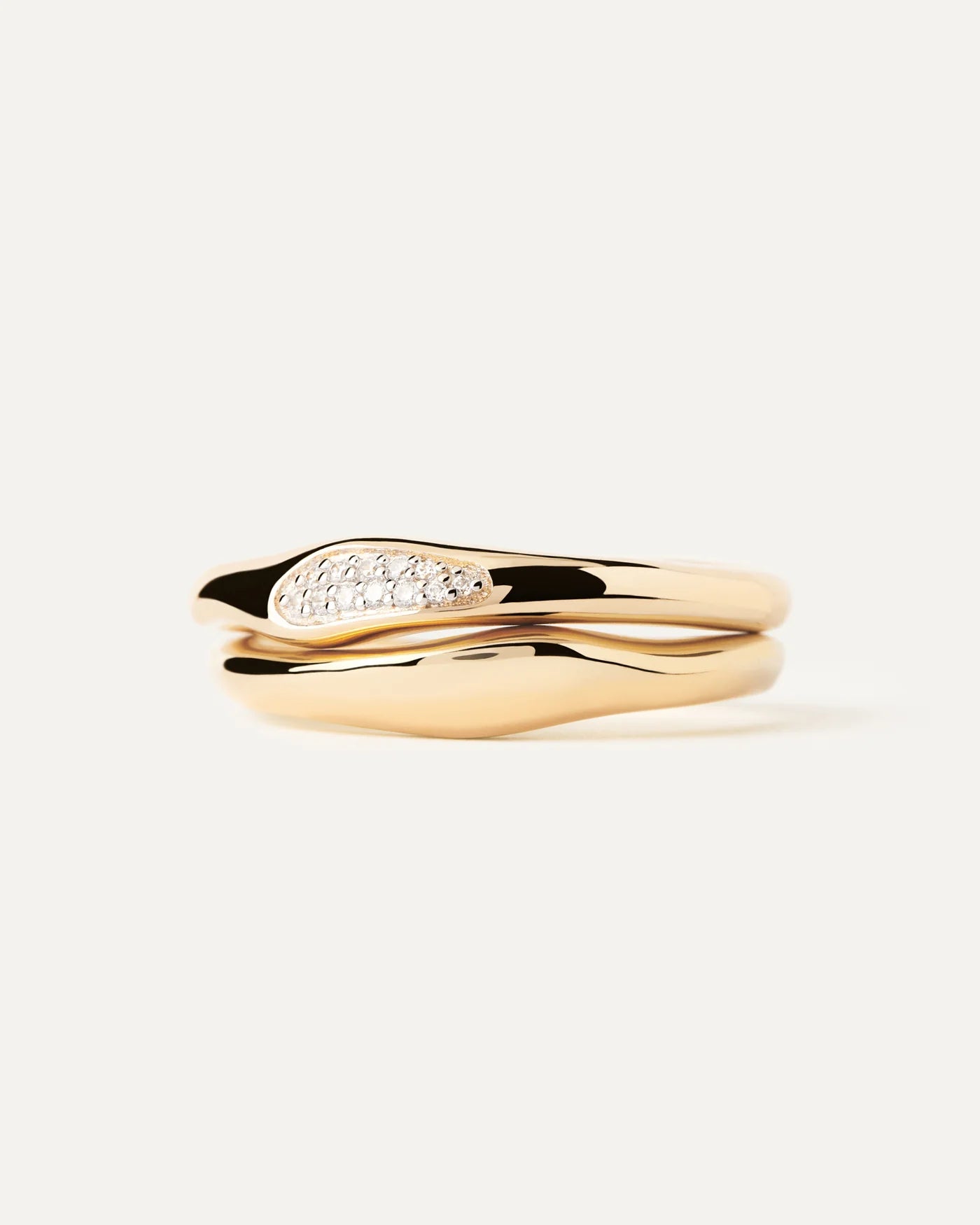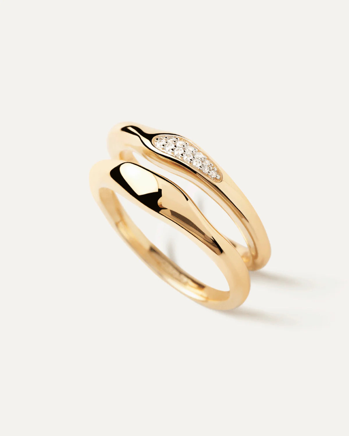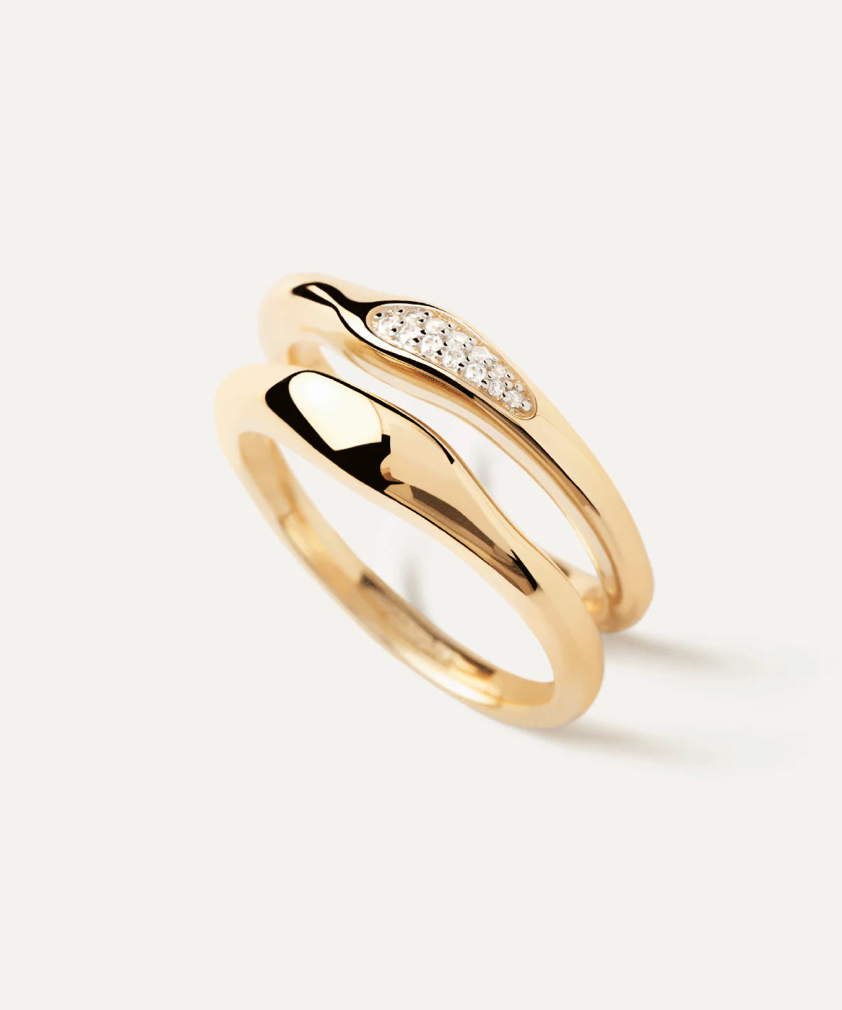 Uno degli anelli è impreziosito da zirconi scintillanti, che aggiungono un tocco di luce discreta e raffinata, mentre l’altro mantiene una linea pura e lucida, perfetta per un look essenziale ma distintivo.