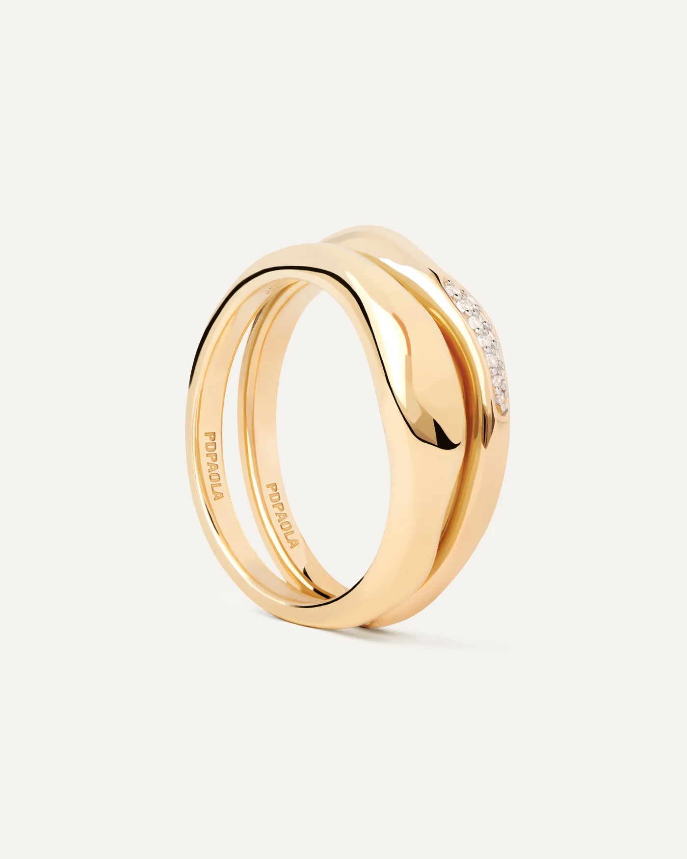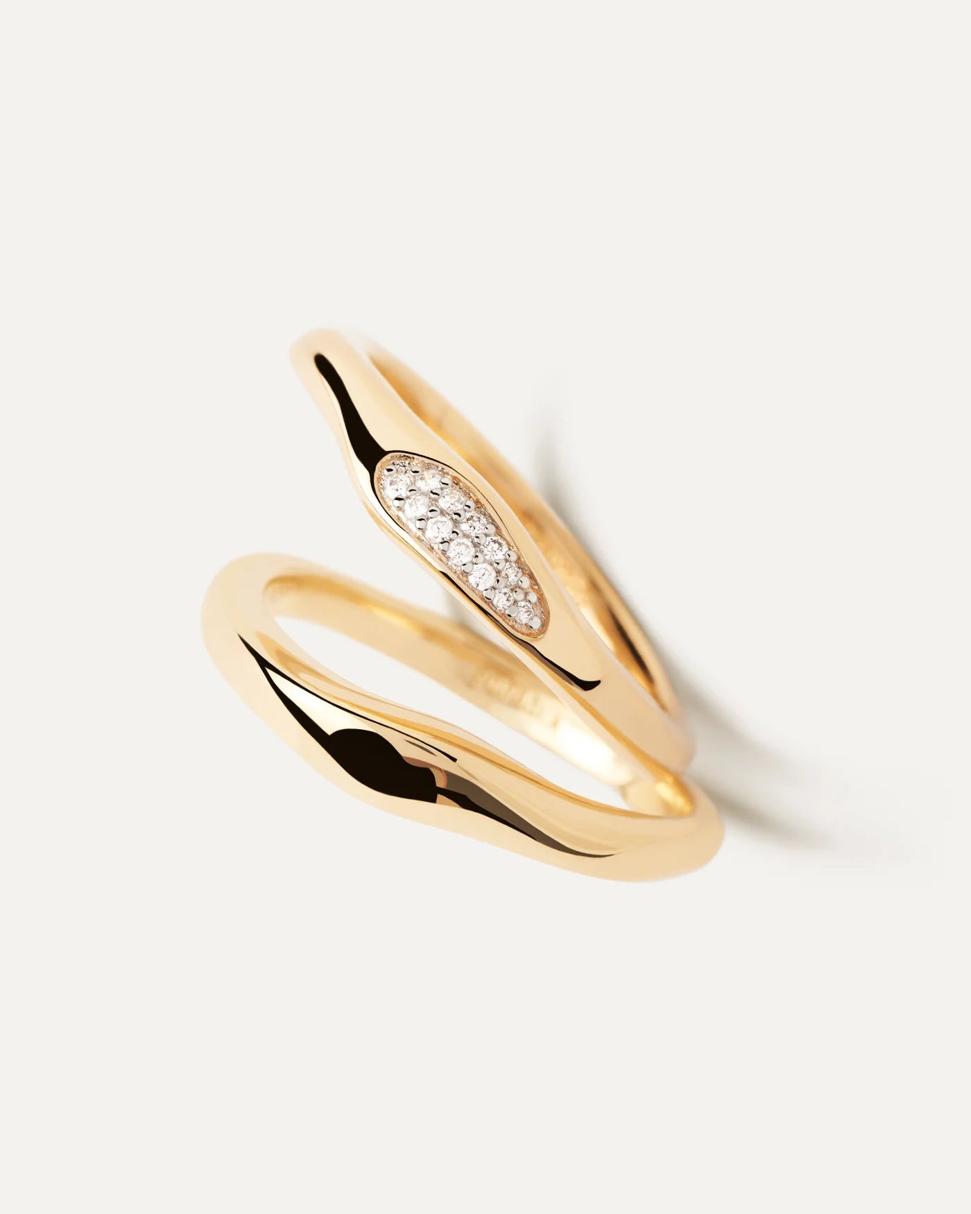 Il design fluido e armonioso gioca con forme ondulate e volumi bilanciati, creando un effetto di movimento delicato sulle dita.