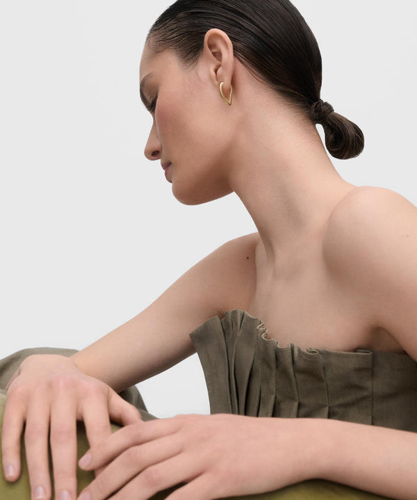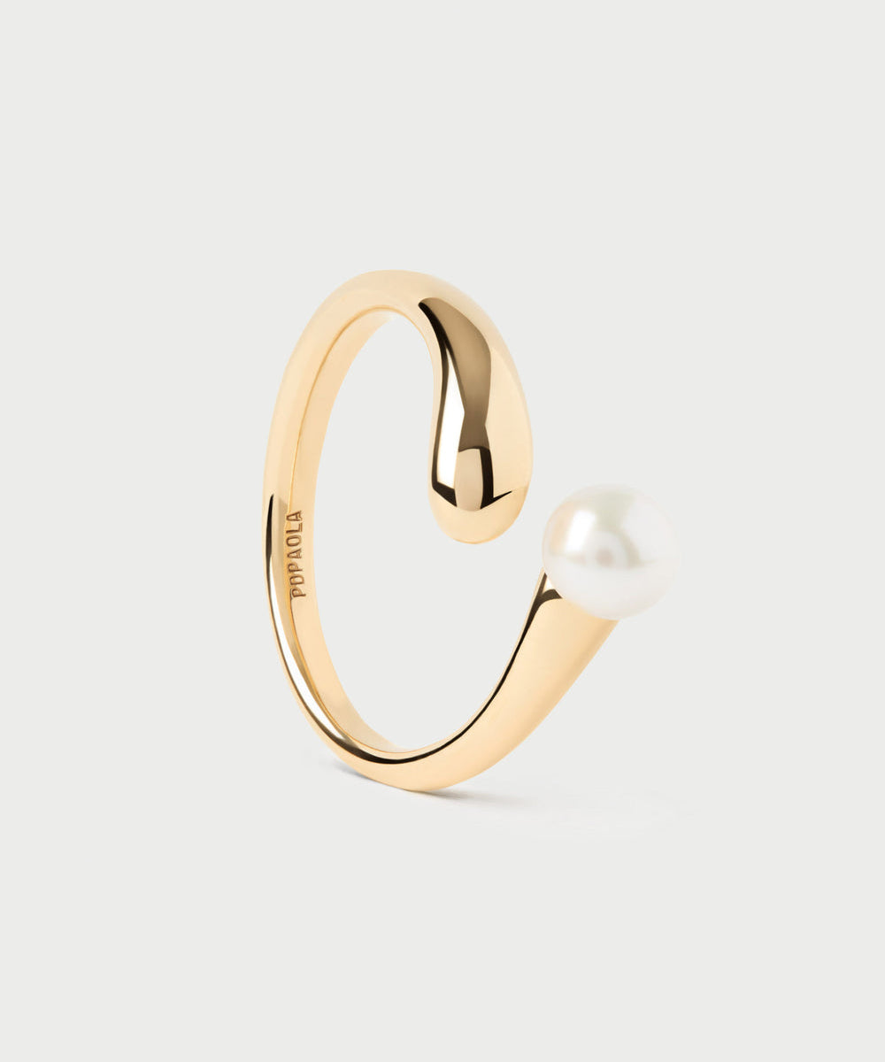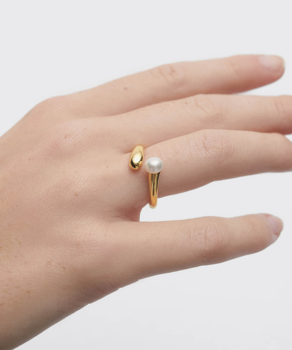 Realizzato in argento 925 placcato oro 18 carati, l’anello si distingue per il suo design aperto ed essenziale, che culmina in una luminosa perla coltivata di acqua dolce.