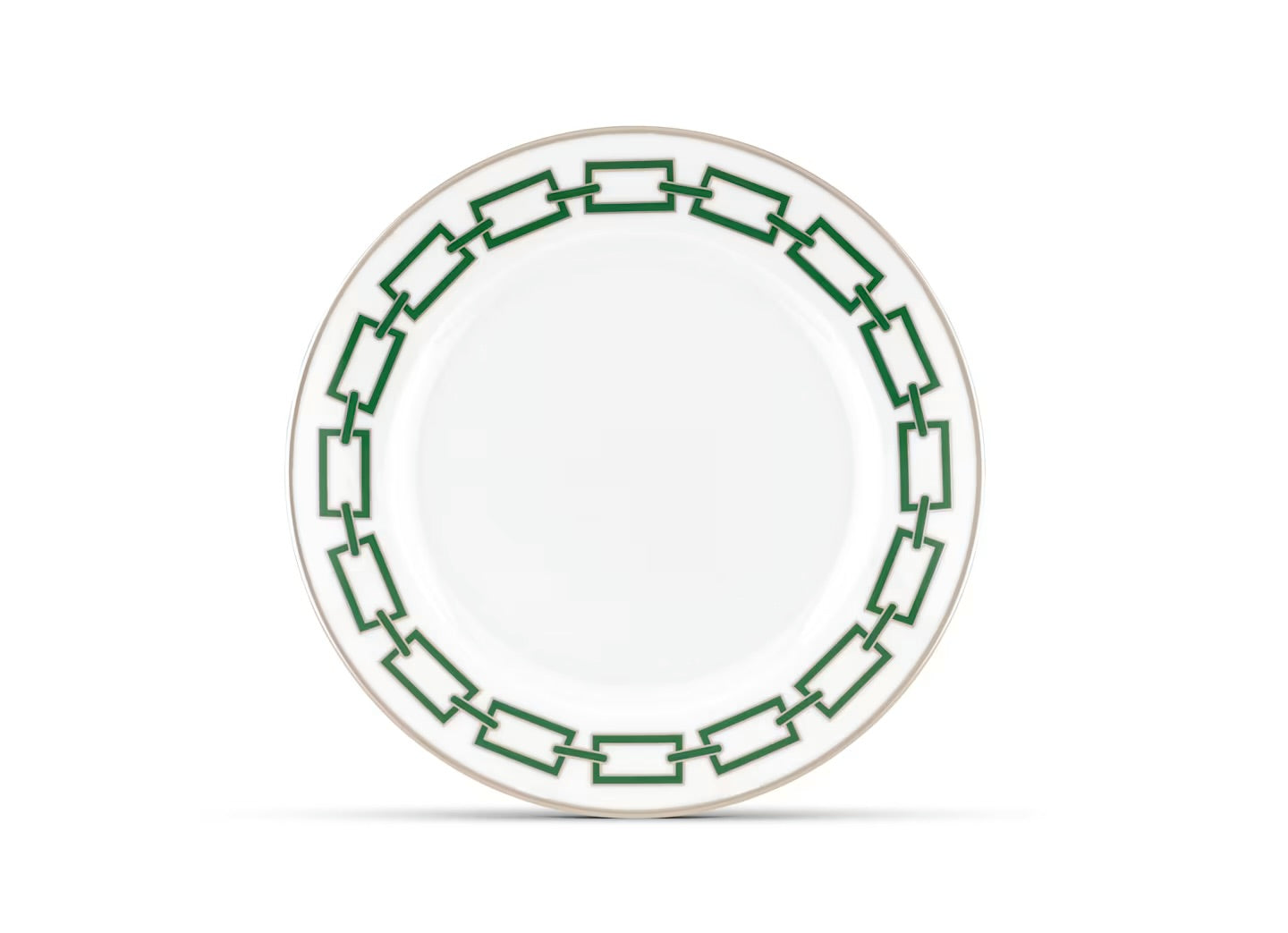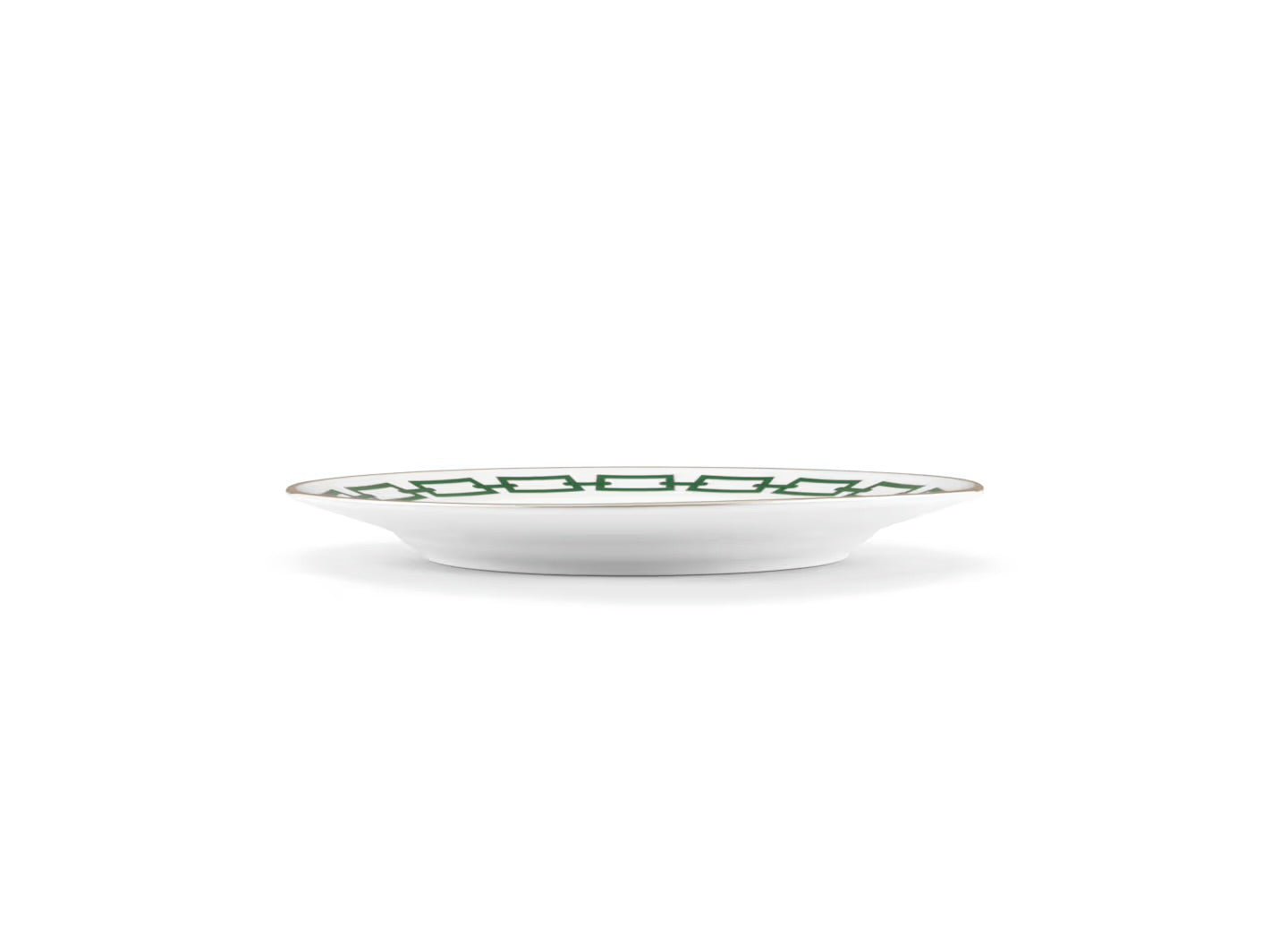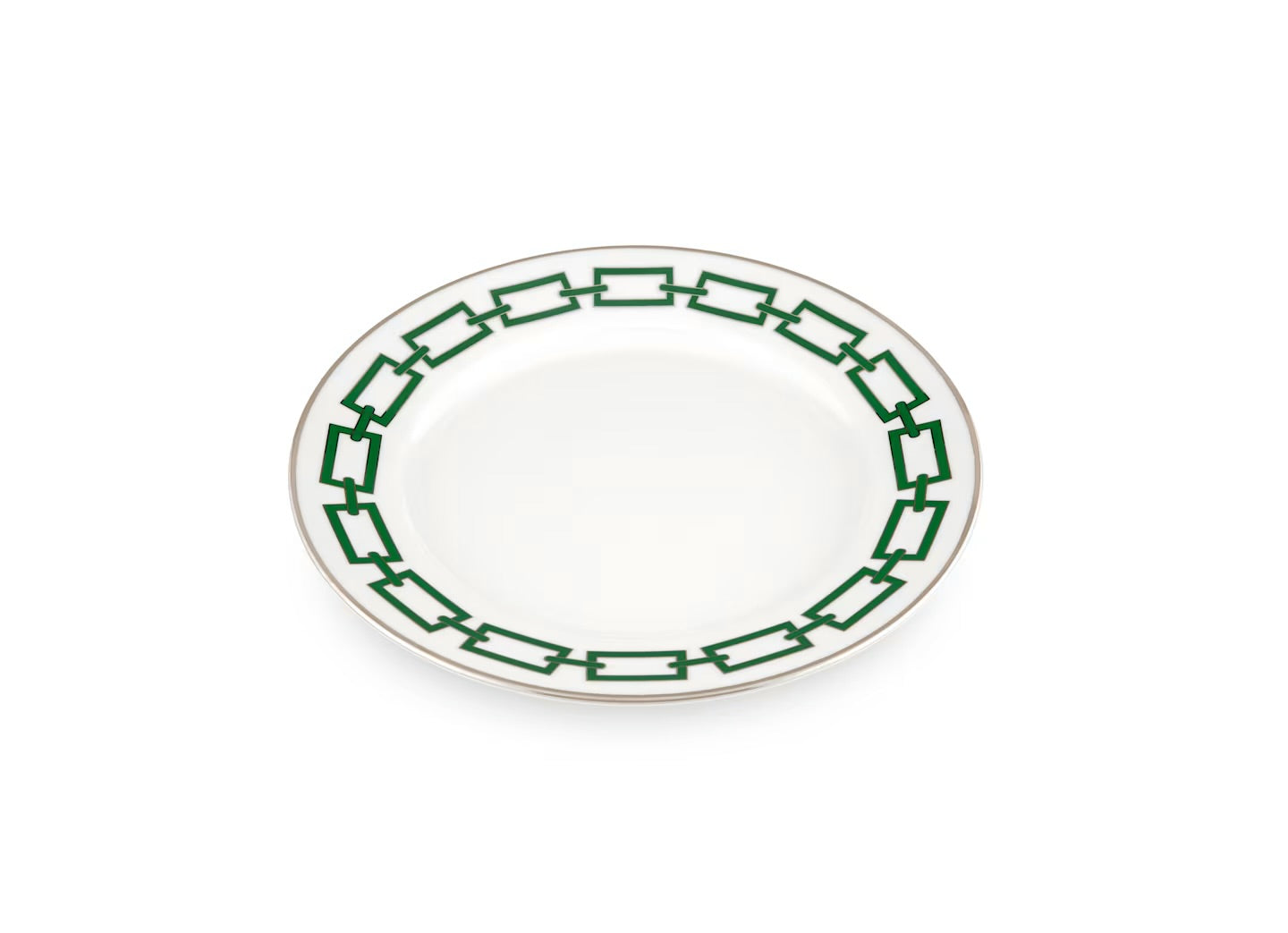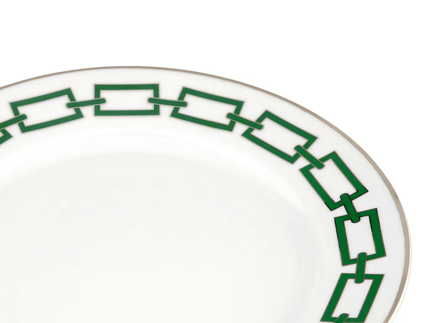 Piatto piano in porcellana con decoro verde smeraldo e platino. Collezione Catene di Gio Ponti.